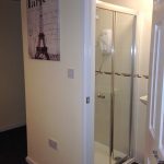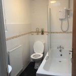 Carpeted flooring, magnolia walls, white ceiling, central lighting, radiator, multiple power outlets, UPVC windows, bed, cupboard, desk, pictures, drawer chest and en-suite. White suite, shower cubical, pedestal sink with hot/cold water spout, w/c white, tiled walls, white ceiling, central light and towel heater.