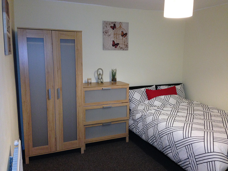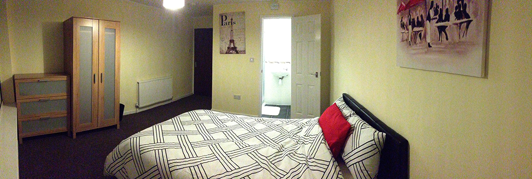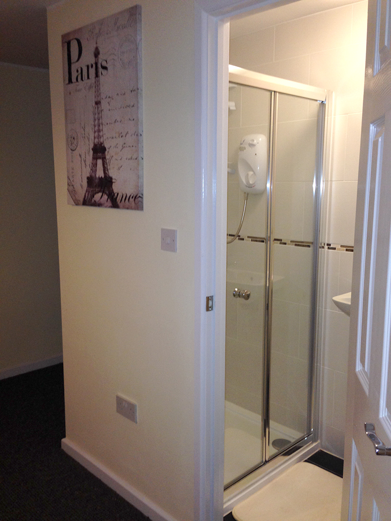 Carpeted flooring, magnolia walls, white ceiling, central lighting, radiator, multiple power outlets, UPVC windows, bed, cupboard, desk, pictures, drawer chest and en-suite. White suite, shower cubical, pedestal sink with hot/cold water spout, w/c white, tiled walls, white ceiling, central light and towel heater.